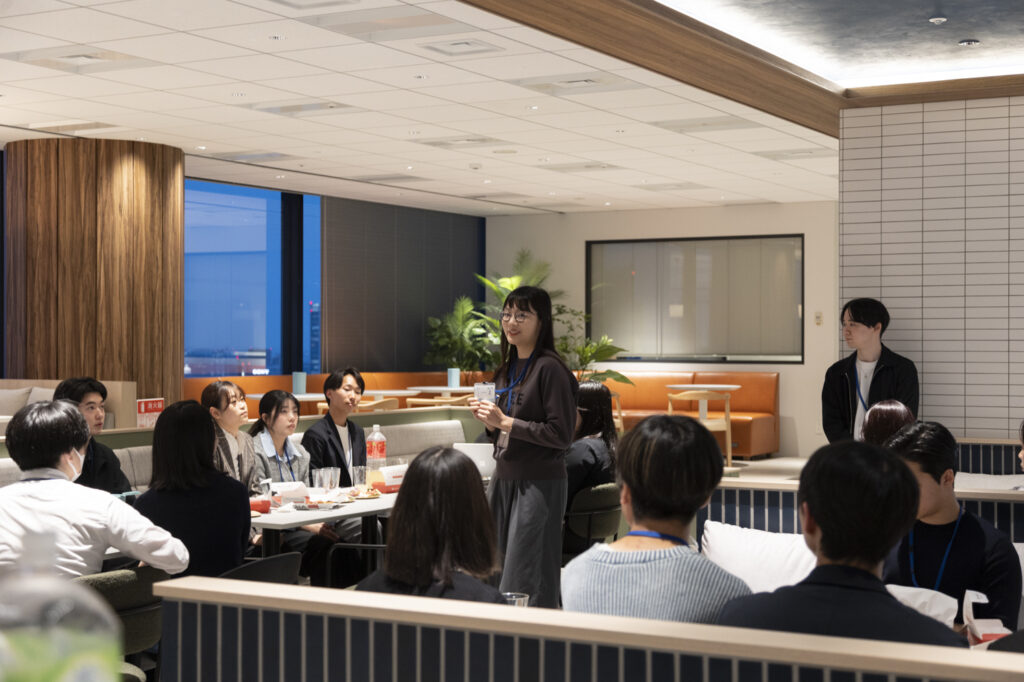 前半は、インターン生がオフィスツアーの案内や社員に向けた質問の整理を先導して行い、後半は、社員が加わり学生が自由に質問できる場を設けました。